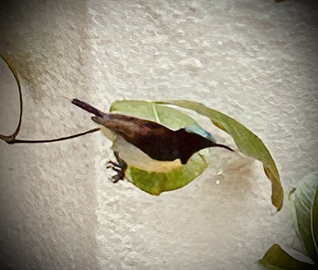 Unfailing midday chirps of the purple rumped sunbird. Sometimes there are 3 of them. Tiny trio but shrill calls. Delicate legs and sharp beaks.
